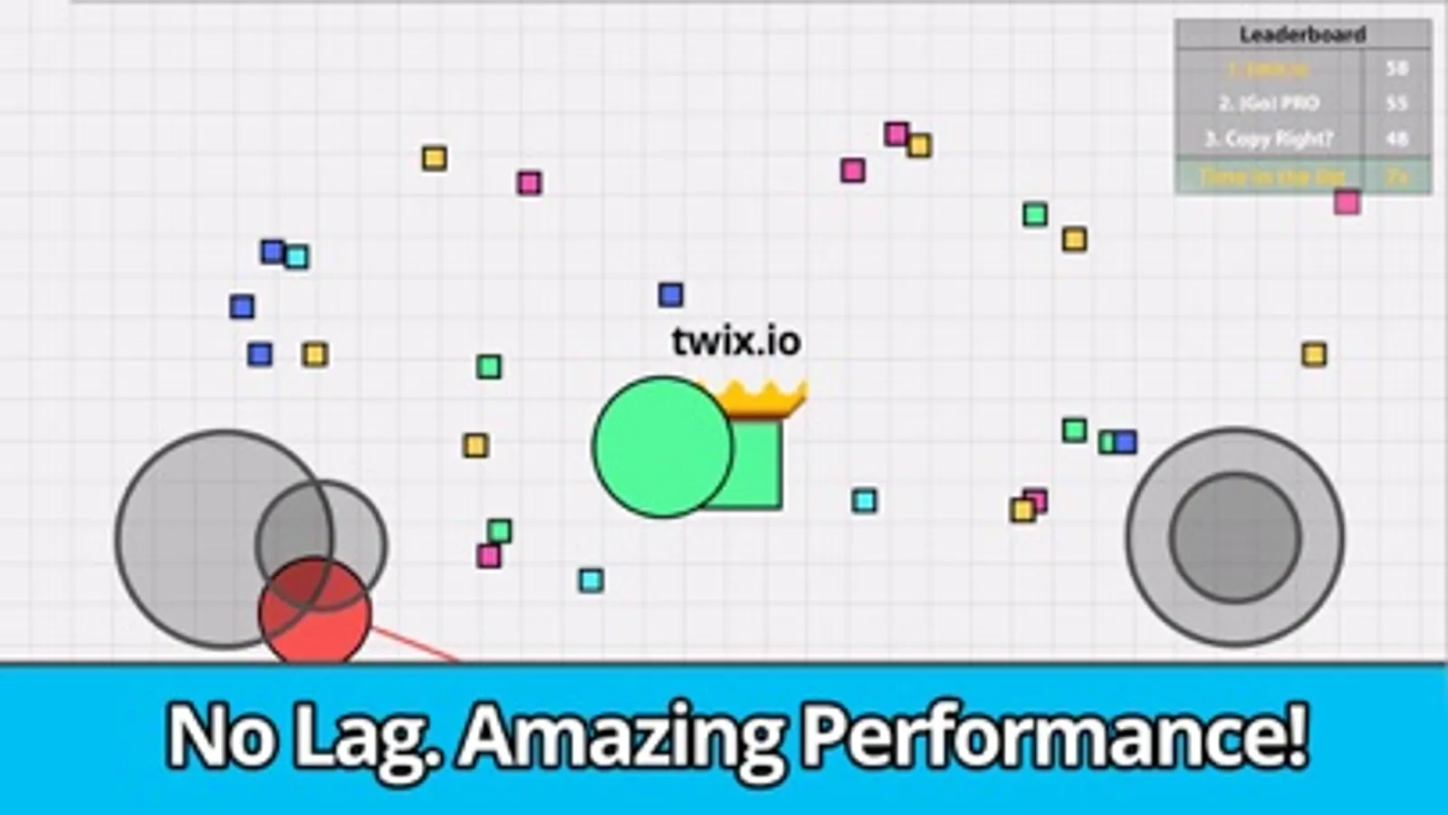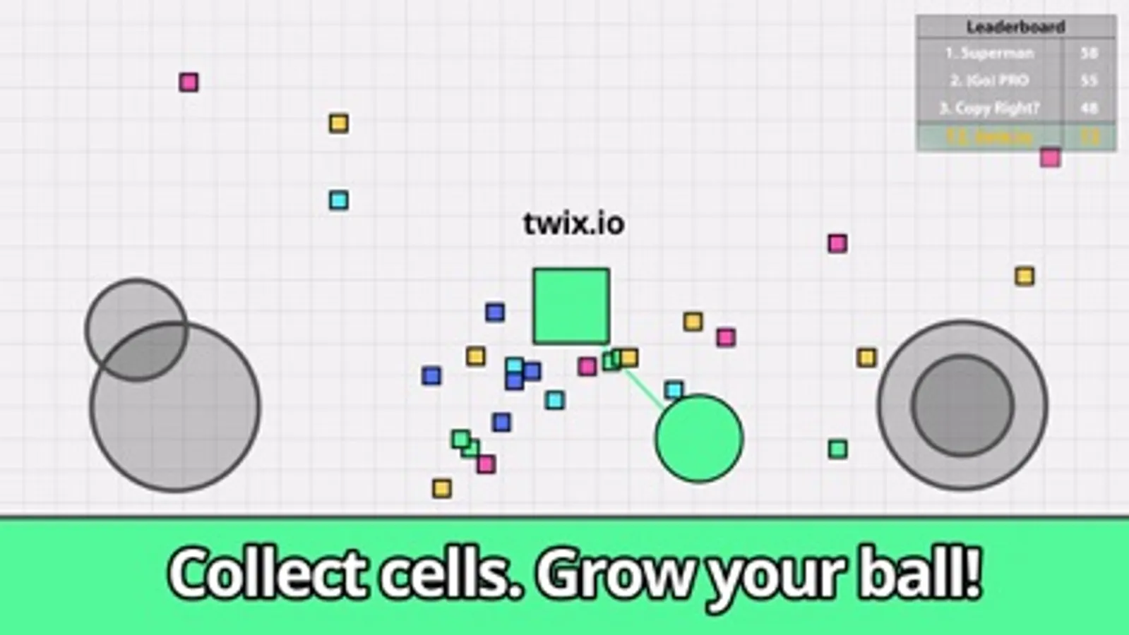 You start the game with a small smasher ball and expand it by hitting other players and collecting little squares. In twix io game, all players have equal chance to win! Even you have a tiny smasher ball, you can bash others to get on the leaderboard. The bigger players you smash, the higher chance you take your spot in the leaderboard.