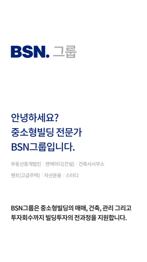 BSN(빌사남)그룹은 중소형빌딩의 매매, 건축, 관리 그리고 투자회수까지 빌딩투자의 전과정을 지원합니다.