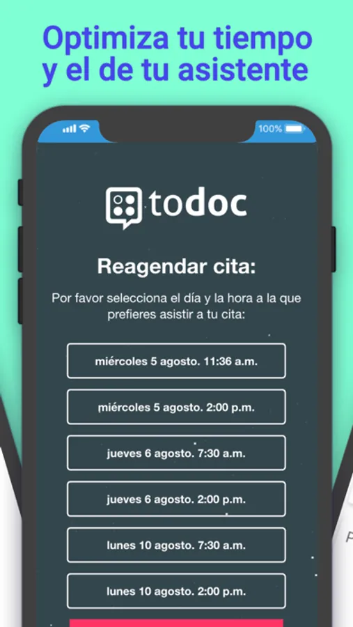 Todoc es la aplicación móvil para WEB y Móvil, que te permitirá dejar a un lado el libro de agendar citas o el google Calendar, para mantener una conversación más fluida y respetuosa con tu paciente, además de reducir sus inasistencias y por tanto mejorar tus ingresos.