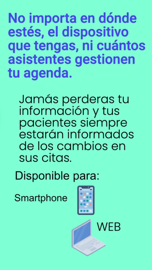 Tener toda la información de tu agenda en tu celular o computador. Ya no dependes de la información que a diario te prepara tu asistente. Ahora él/ella se puede dedicar a realizar actividades de mayor valor añadido para tu consultorio y para ellos.