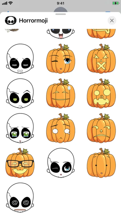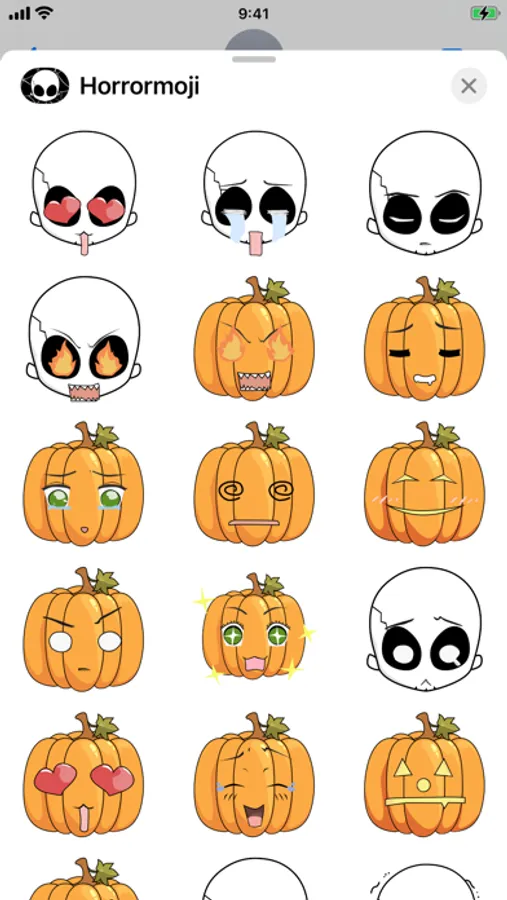 Make your conversations even more fun with this set of hallowing themed emoji. Choose from a variety of emotions and use the pumpkins, skulls or a cute little owl to express yourself.