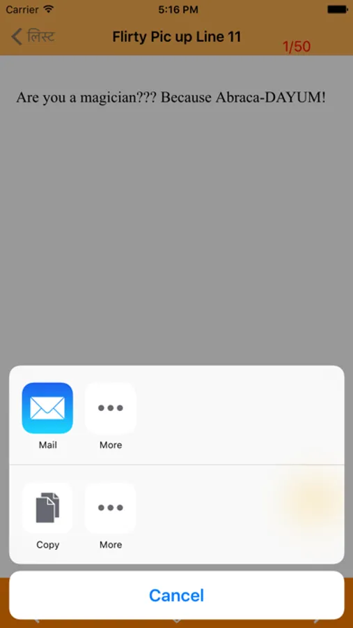 This application lets you browse pick up/chat up lines, and mark them as favorite. Send them through SMS, Email, Messenger etc.