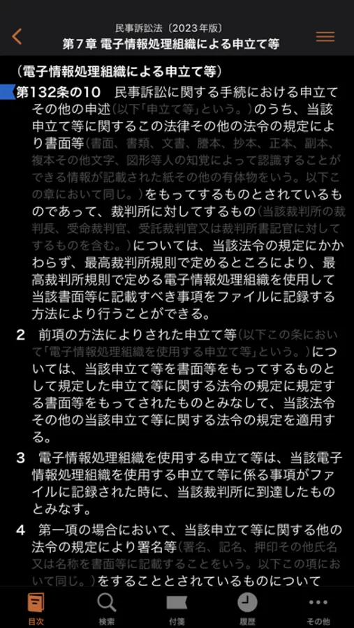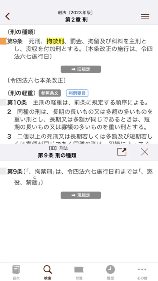 アプリ内課金で追加購入できる「模範六法 2023 令和5年版」は、384件の法令と判例要旨14,779件を収納した伝統ある判例六法の決定版です。民事訴訟法(民事裁判手続のIT化)、刑法(拘禁刑制度の創設、侮辱罪の法定刑引上げ)の大改正を収録し、その他道路交通法、消費者契約法、消費者裁判手続特例法、刑事施設処遇法等の改正に対応しています。また困難女性支援法、コーポレートガバナンス・コードを新収録しています。