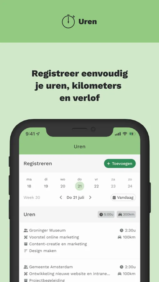 Uren | Registreer eenvoudig je uren, kilometers en verlof