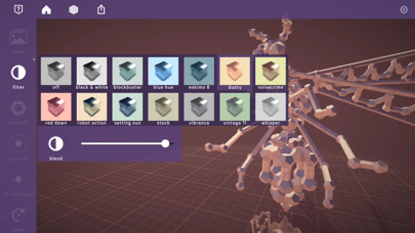 Once your design is complete, go into the in-app photo studio where you can apply filters, different backgrounds and lighting effects to your creation. When you’re done, save to the photo gallery or share directly to social media and show off your creativity. You can even export your finished design as a 3D .OBJ file.