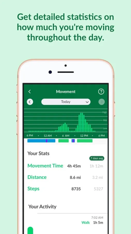 • Discover insights about your rest: Get detailed stats such as duration, interruptions, turns and tosses. Advanced analysis lets you see how efficient your night's rest was, and compare it with your weekly average to identify patterns.