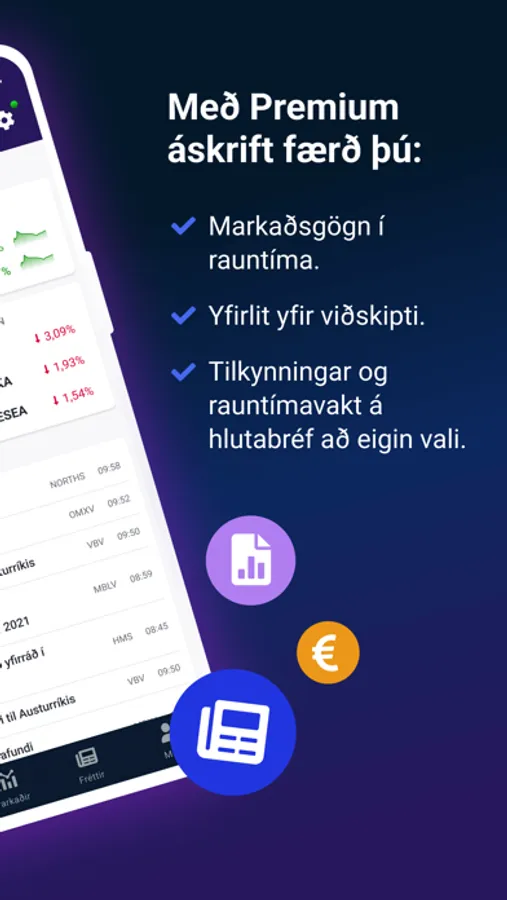 Please note that even if a lot of the features are free of charge you will need to buy a monthly subscription to "Keldan Premium" to gain access to premium features of the app and access to real time market data.