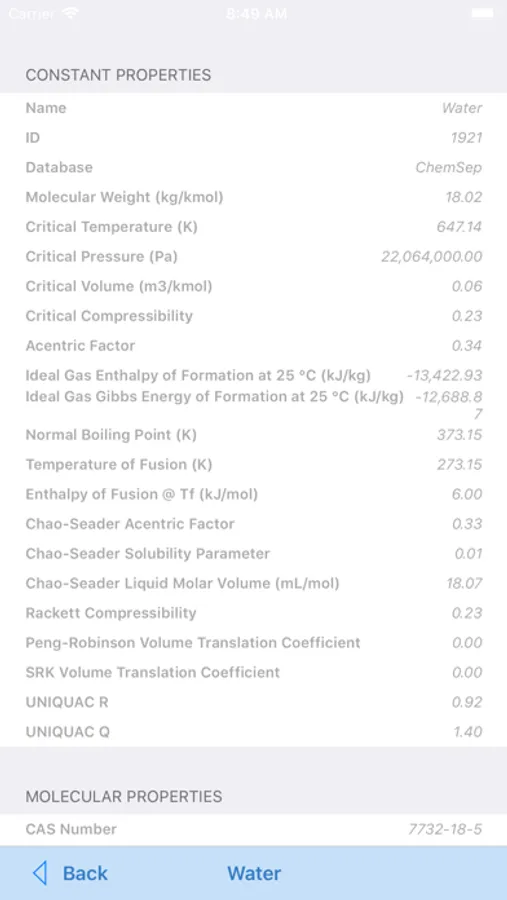 - Single-compound properties: Critical Parameters, Acentric Factor, Chemical formula, Structure formula, CAS Registry Number, Boiling Point Temperature, Vapor Pressure, Heat of Vaporization, Ideal gas Enthalpy, Ideal gas Enthalpy of Formation at 25 C, Ideal Gas Gibbs Free Energy of Formation at 25 C, Ideal Gas Entropy, Heat Capacity Cp, Ideal Gas Heat Capacity, Liquid Heat Capacity, Solid Heat Capacity, Heat Capacity Cv, Liquid Viscosity, Vapor Viscosity, Liquid Thermal Conductivity, Vapor Thermal Conductivity, Solid Density, Liquid Density and Molecular Weight