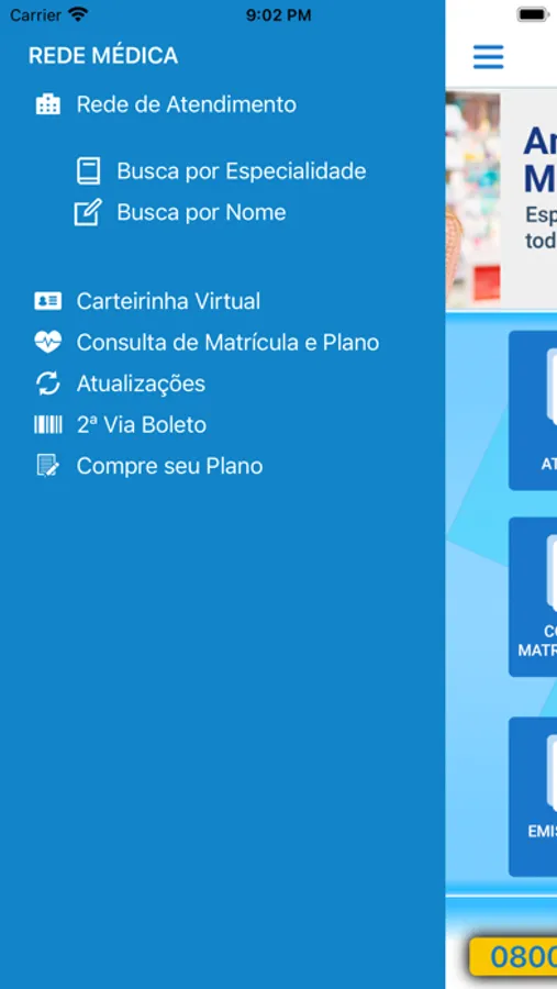 - Buscas por médicos e prestadores da Rede de Atendimento com localização exata e mapa;