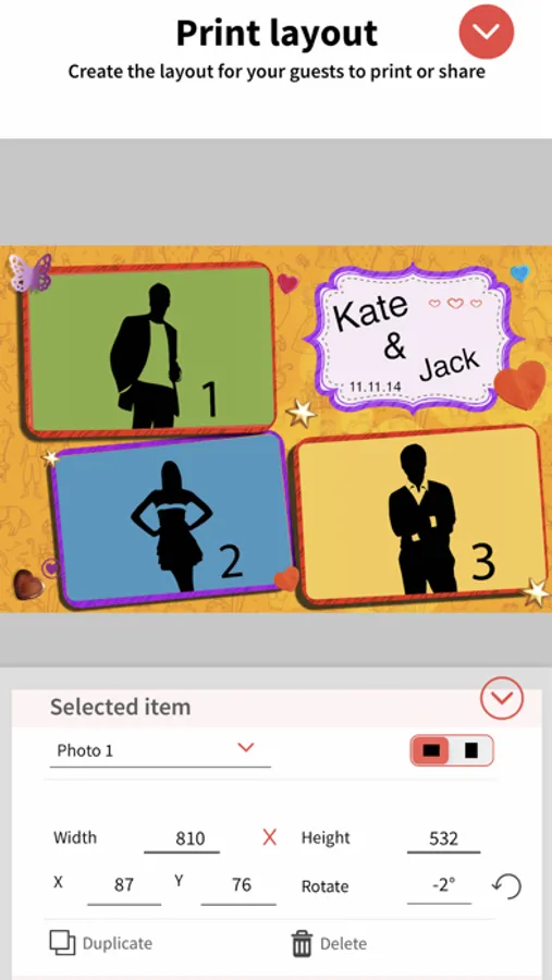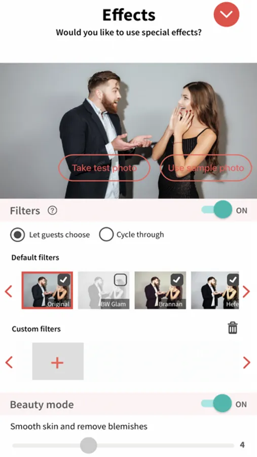 Create a custom layout using the built-in editor to add photos, images, logos, and text. Optionally setup custom camera settings for both front and rear camera with settings that include: exposure, white balance, and video stabilization. Set up your booth to generate prints, animated GIFs, boomerangs, and videos in normal, sped-up or slow-motion speeds. Guide your guests through the photo booth experience using video and audio prompts. They can optionally add stickers to the print strips and pre-built and custom filters. You can also turn on surveys for data collection and require a disclaimer if needed.