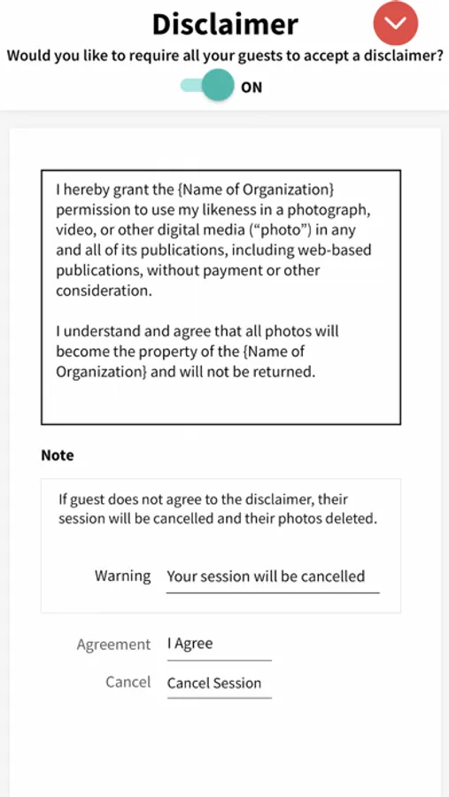 For corporate events, setup a custom disclaimer and/or survey to display to guests and require them to accept before proceeding with their photo booth session.