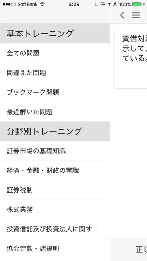 ・トレーニング(全問ランダム、間違えた問題、分野別等)
