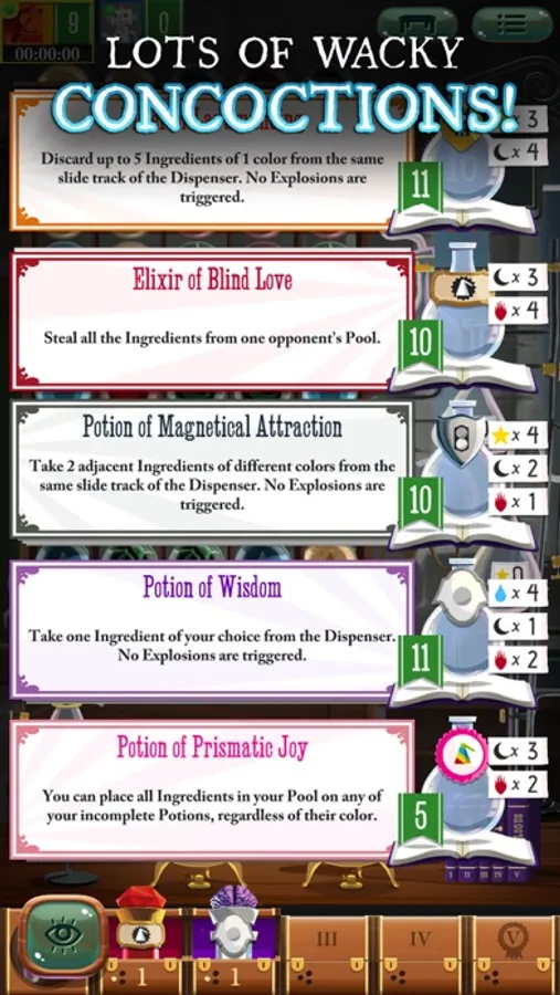 At the beginning of the game, each player is given potions to complete with specific effects and ingredients. You will have to select ingredients in the dispenser; once your selected ingredient is removed, the ingredients above will slide down. If two ingredients of the same nature collide, they explode and you get them too! You can then use your ingredients to cook up your potions. You only have a limited tank space to store remaining ingredients from one turn to another, so choose carefully! Once a potion is completed, you score points, get to use its powerful effect and pick another potion to craft. The wizard with the most points wins!