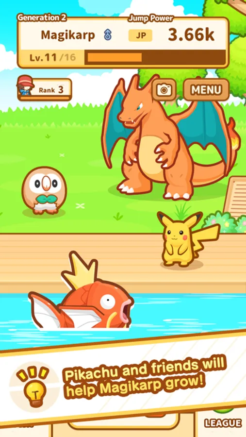 A number of popular Pokémon can appear to help your Magikarp grow. Keep playing to find out which Pokémon you'll befriend!