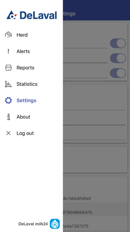 DeLaval milk24 iPhone app provides access to data stored in the milk24 cloud, that is: