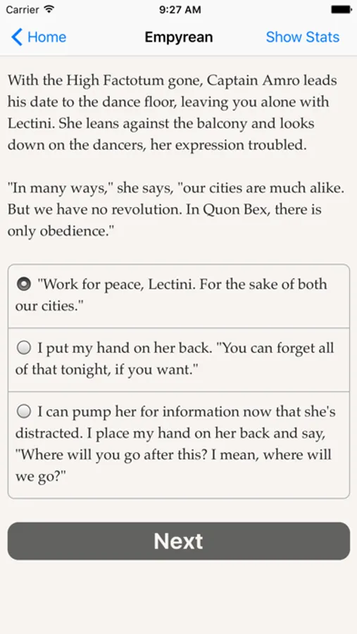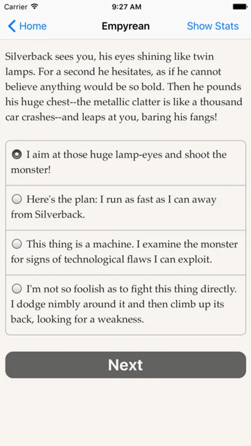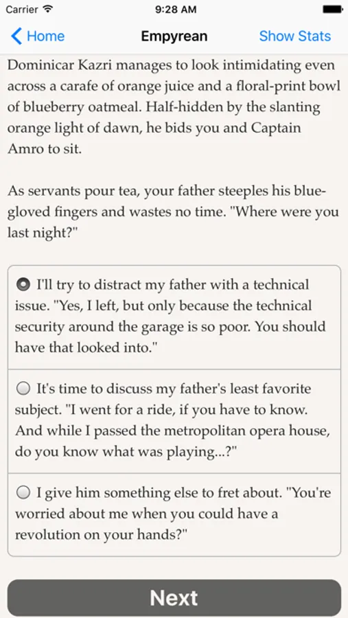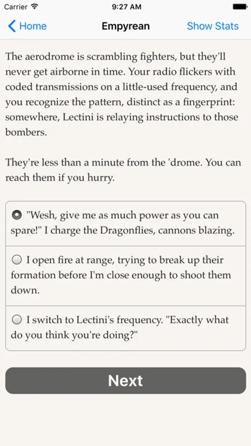 "Empyrean" is an interactive "flying ace" novel by Kyle Marquis where your choices control the story. It's entirely text-based—325,000 words, without graphics or sound effects—and fueled by the vast, unstoppable power of your imagination.