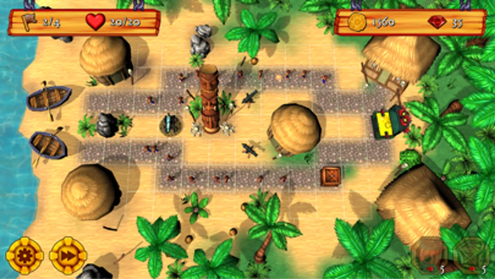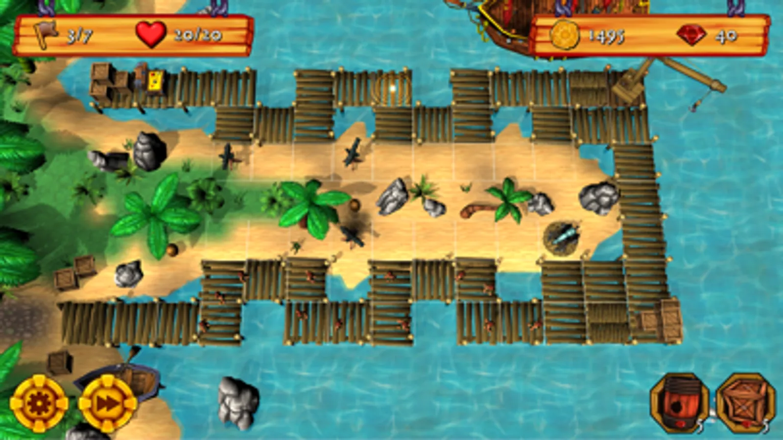 Fallen pirates will occasionally drop gems which you can tap to collect. Gems can be spent on helpful items, like a powder keg that blows grunts to smithereens, a voodoo drum that turns grunts into lumbering zombies, or a smoke bomb that hides your cannons from enemy view! Simply tap a path tile to deploy an item at any point during a level. You can also tap the fast-forward button at any time to speed up the action.