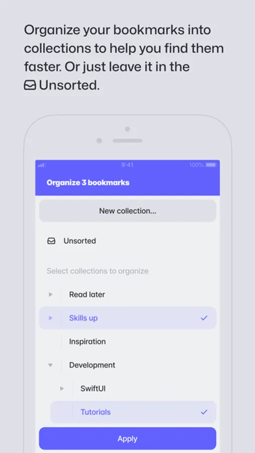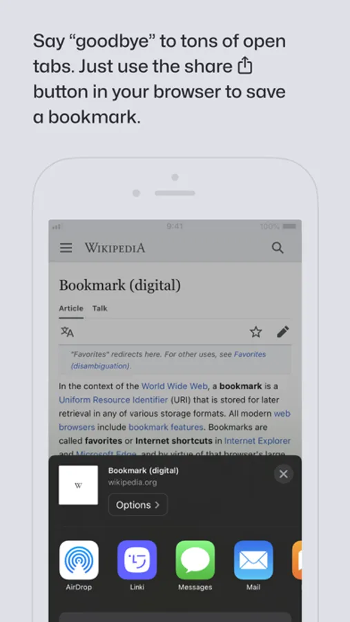 Start saving bookmarks from anywhere across the web quickly and easily. Just install the app and use the "Share" button in your browser to save a bookmark.