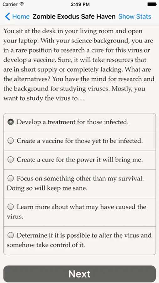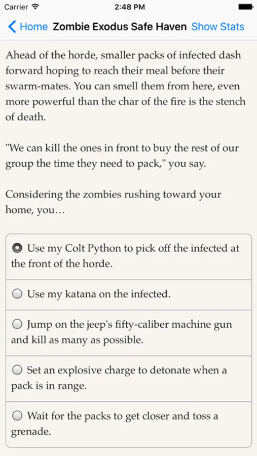 • Choose your skill levels in eighteen different apocalyptic skills such as Stealth, Ranged Weapons, Scavenging, and Survival. Level up your skills after each chapter and choose from hobbies to round out your character.