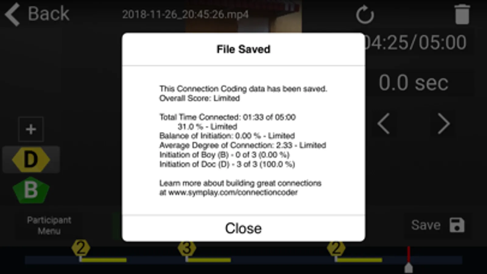 Connection Coder by SymPlay is designed to assist you to look at how interactions between participants help them to be connected in meaningful social communication. It was developed to help caregivers (parents, teachers, and others) as well as researchers track and get feedback on these interactions. Many researchers look at video to understand and help improve interactions. This usually requires a team of people to create and analyze the video. It is time consuming, expensive, and must be done in a lab or university setting. Connection Coder is far simpler and meant to be used in natural environments such as at home, at school, and during other activities or therapy sessions.