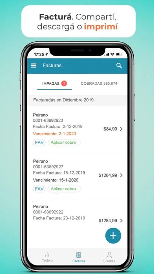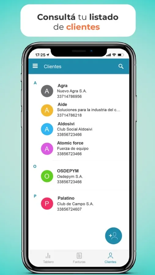 - Visualizar un listado con todos tus clientes. Buscarlos por nombre, CUIT o razón social. - Agregar clientes nuevos en esta instancia o mientras generás una factura.