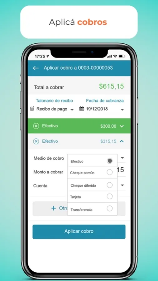 - Aplicar a tus facturas cobranzas parciales o totales con distintos medios de cobro.