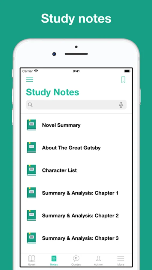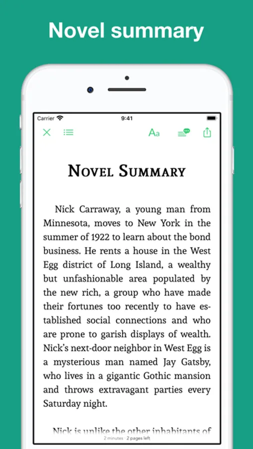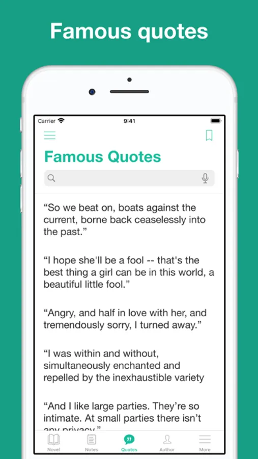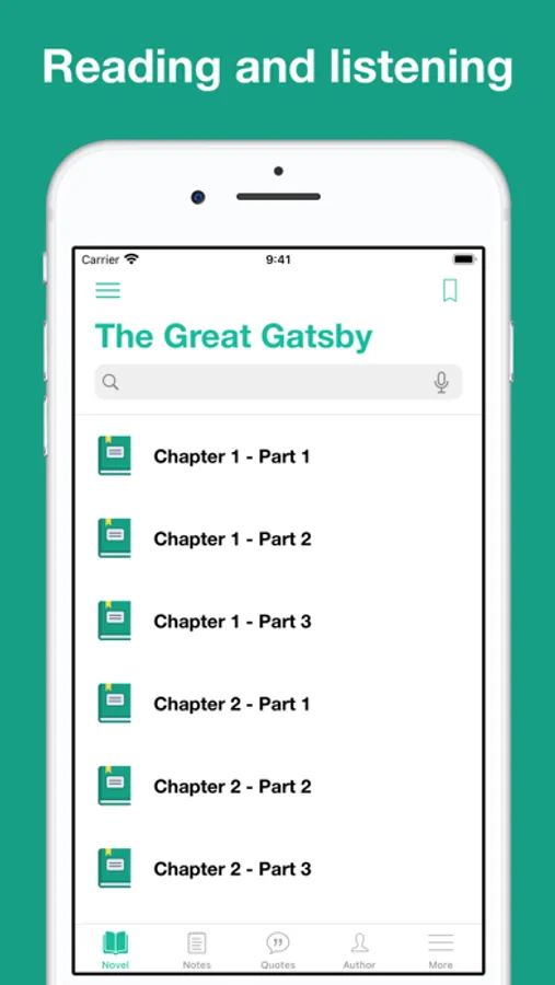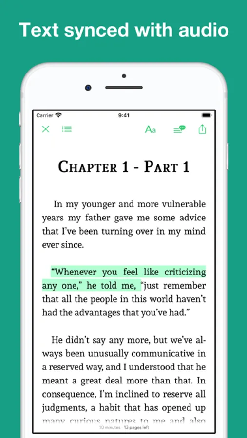 This app combines the novel "The Great Gatsby" with professional narration enabling advanced functions like sync transcript, read aloud (a professional narration synchronized with the highlighted text.)