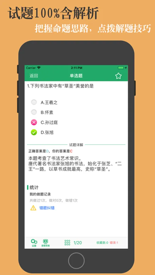 5、随机练习:随机生成试题模拟测试,检验复习成果,可自动将错题加入到错题库。