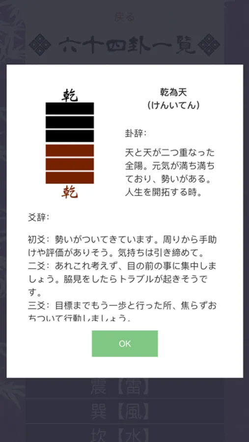易には『八卦』と呼ばれる8つのファクターがあり、世界はこの八卦の組み合わせ8x8=64の事象に分類できる考えるのが『易』です。さらにその64の答えから、そのあとどうすればいいかを占う場合、「変爻」という技を使います。本アプリでは変爻で示される答え64x6=384のパターン全てを網羅