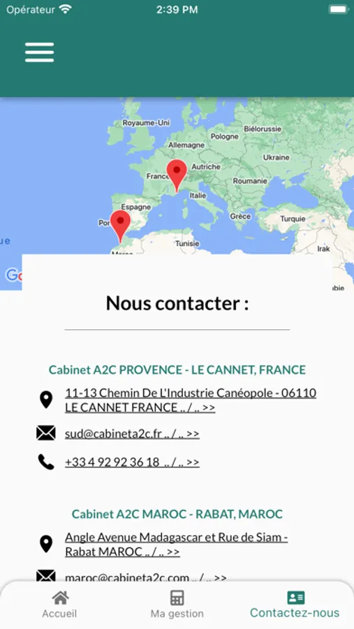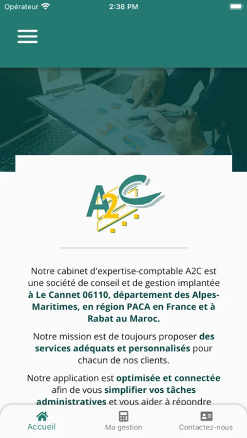 Le Cabinet A2C est une société d’expertise comptable implantée au Cannet (06) en Provence-Alpes-Côte d'Azur et à Rabat au Maroc.