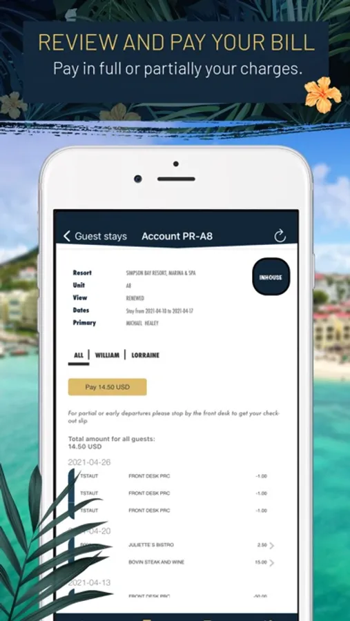 During your stay, check all your purchases and orders and confirm them the moment you make them. Before your checkout, you can even use the App to pay your bill with your credit card.