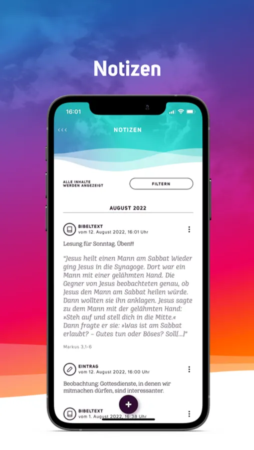 - In den persönlichen Notizen kannst du eigene Gedanken, Bilder, Videos und Bibelstellen speichern.