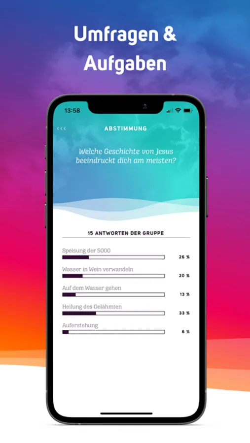 - Gruppen: Du kannst mit mehreren Gruppen kommunizieren. Nachrichten, Bilder, PDFs, Links und Bibelstellen können ausgetauscht werden. Die Leitung kann Aufgaben, Umfragen und Termine teilen.
