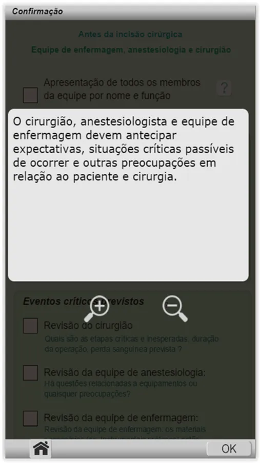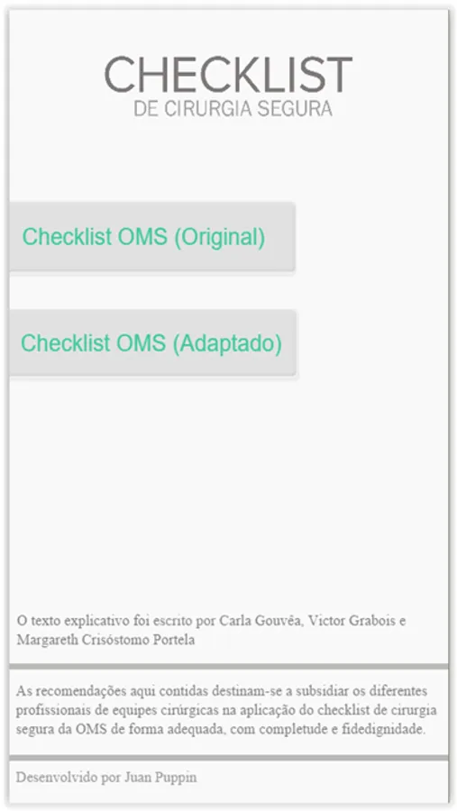 O instrutivo contempla a versão original do Checklist, assim como a versão adaptada no âmbito do projeto de pesquisa Desenvolvimento e avaliação de uma estratégia para a implementação do checklist de cirurgia segura da OMS, conduzido pela Fundação Oswaldo Cruz, em parceria com o Hospital Universitário Pedro Ernesto da Universidade do Estado do Rio de Janeiro, o Hospital Universitário Onofre Lopes da Universidade Federal do Rio Grande do Norte e o Hospital Federal Servidores do Estado.