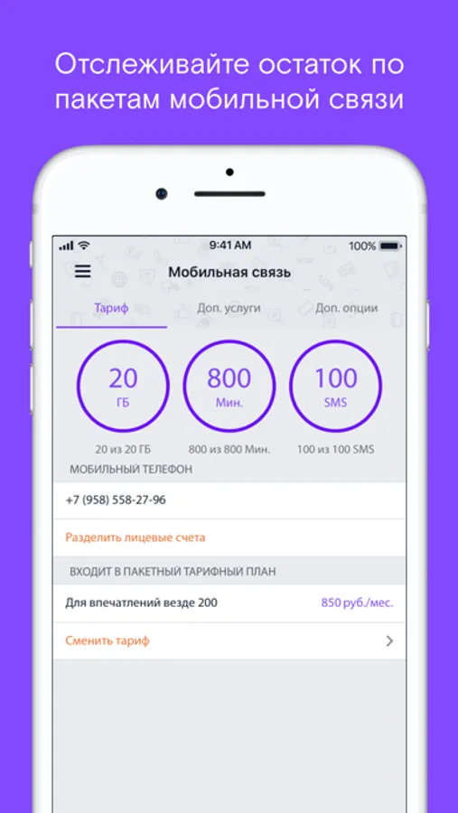 - отслеживать остаток по пакетам мобильной связи, менять минуты на гигабайты
