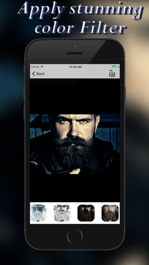 You can choose between more than 50 beard. Take a picture or choose one from your camera roll, load your favorite beard and apply some awesome filter to it.