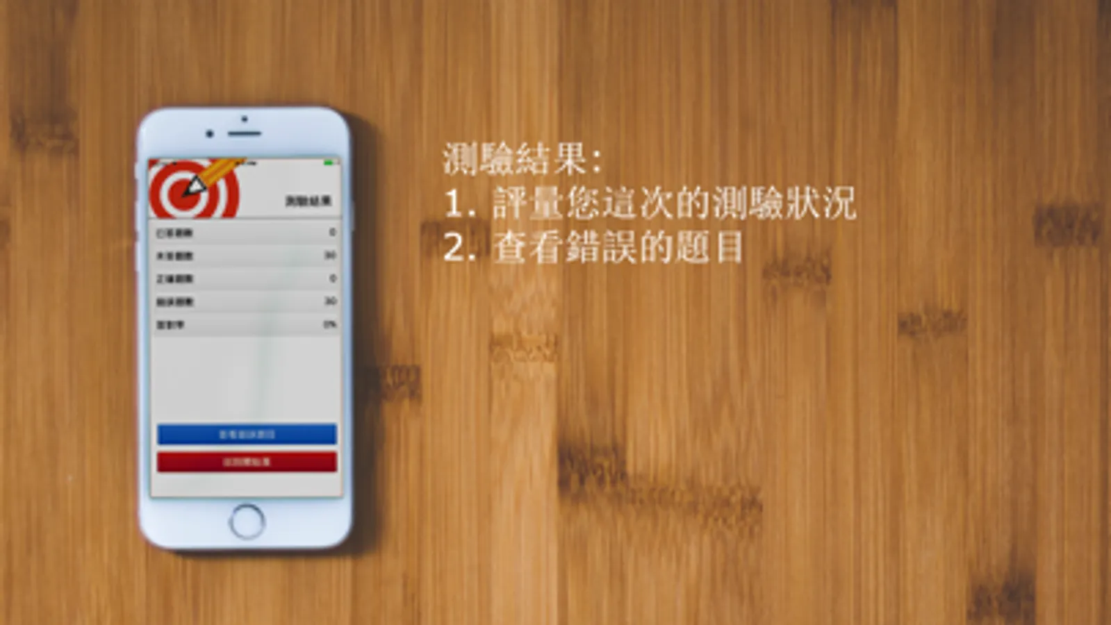 提供依照各分類提供20~50題,使用者可選擇按部就班測試或是隨機出題,當然也可以將不熟的考題存下來並自己加入註解。