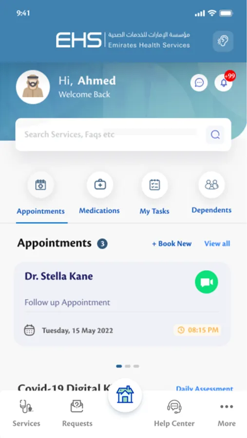EHS App provide secure access to various patient services i.e. Appointment Booking, Medical Report request, Medicine Dispense, Home Mobile Care, Queue Management, Blood Donation request. The application employs a full-scale integration with our health care information systems i.e. WAREED, which centrally connects EHS’s medical facilities in-order to cater user needs and obtain up-to-date Medical Records, and Clinical Information. App users may also integrate with their wearable devices to obtain the basic vitals via Apple Health