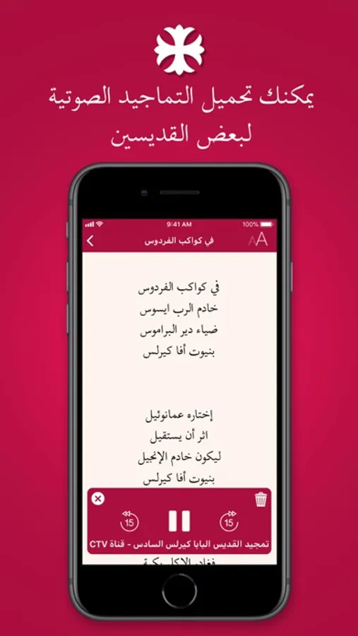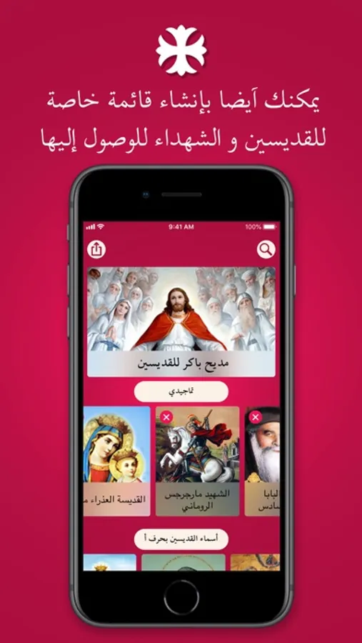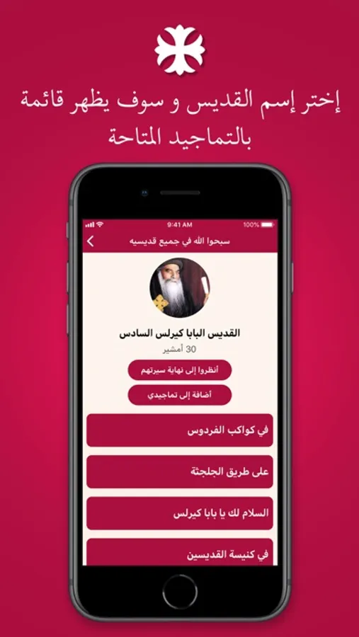 اختر الحرف الذي يبداء به اسم القديس و سيتم ظهور قائمة من التماجيد المتاحة و يمكنك ايضا تحميل التمجيد الصوتي