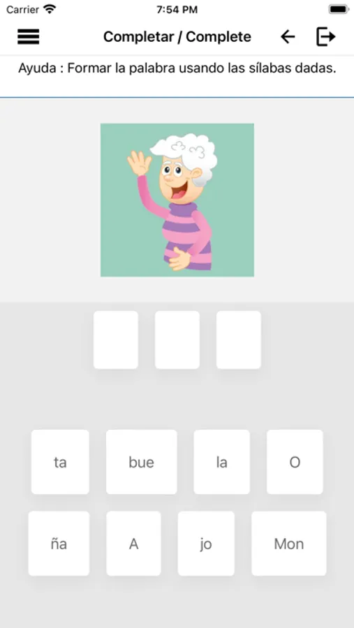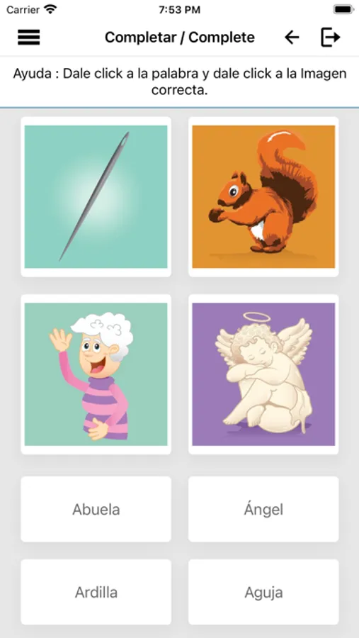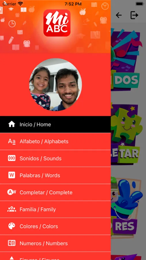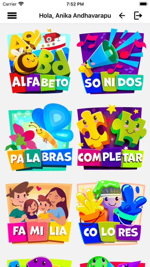 - 8 Módulos: Letras, Vocales, Sonidos, Números, Familia, Colores, Palabras y Completar.