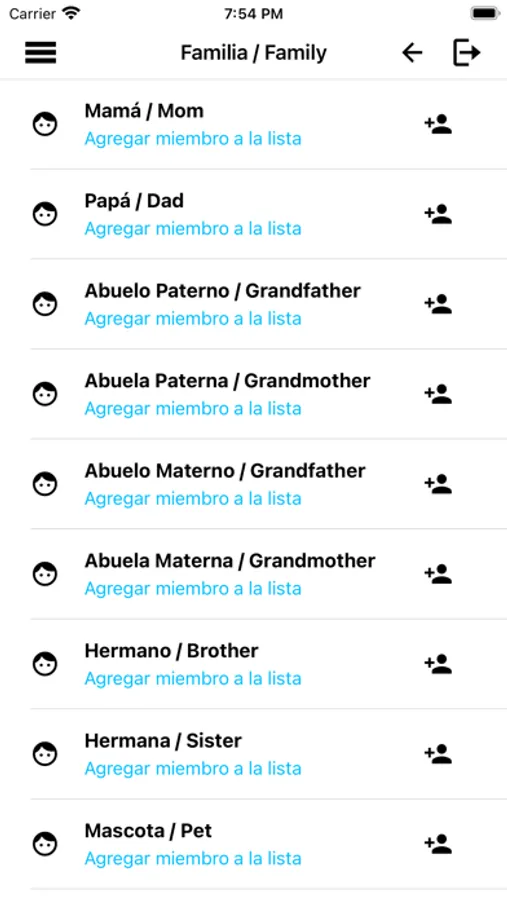 - Se puede agregar miembros de la familia, mamá, papá, hermano, hermana, abuelo, con foto y nombre con sonido.