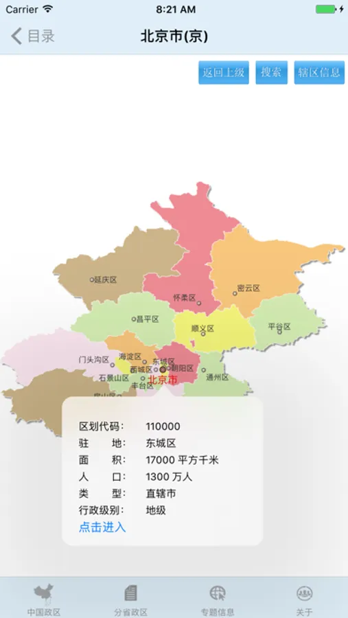 本软件来自专业权威的编写机构——中华人民共和国民政部和中国地图出版社强强联手打造,是必备的工具软件:准确、翔实的县级以上行政区划信息;全国、省级、县级多级跳转;点击显示县级以上地名信息,包括行政区划代码、区号、行政级别、下级单位个数、人口、面积等等。全新的视觉体验——使用了全彩地图,形式更加活泼,使用更加方便。简洁易用——本产品充分利用移动平台的新特性,将多点触摸、浮动显示等iPad特点与地图结合展现。更新及时——与民政部网站同步更新。同时,软件含有搜索查询功能,可实现地图及相关数据信息查询检索。
