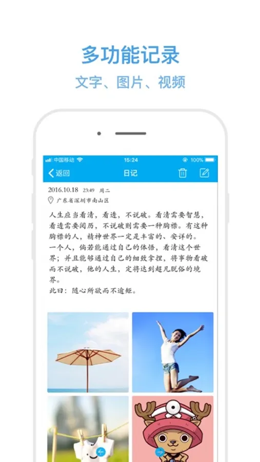 「照片视频」每篇日记可添加20张照片、2个视频,不再单纯的文字