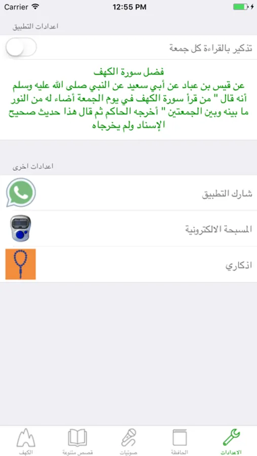 -التنبيه: يقوم التطبيق بتنبيهك يوم الجمعة لقراءة سورة الكهف