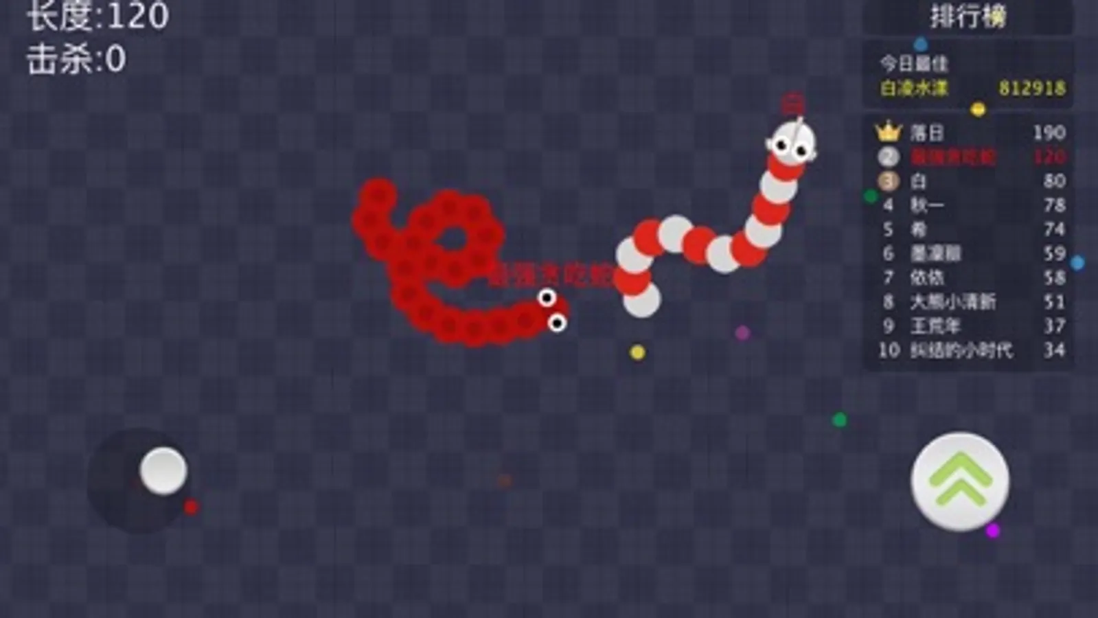 1.控制摇杆走位你的小蛇,吃掉地图上彩色的小圆点,就会变长。