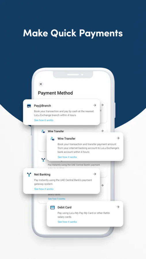 Pay Using: Debit card, Internet Banking or Net Banking, Wire Transfers, Salary debit card or WPS cards, Wallet, Cash at Branch (Payment options are subject to availability in your sending country)