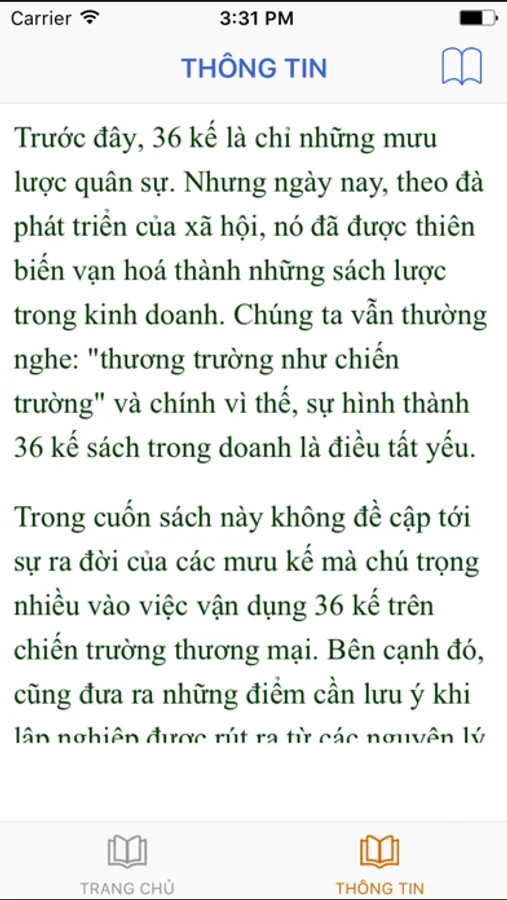 Trong cuốn sách này không đề cập tới sự ra đời của các mưu kế mà chú trọng nhiều vào việc vận dụng 36 kế trên chiến trường thương mại. Bên cạnh đó, cũng đưa ra những điểm cần lưu ý khi lập nghiệp được rút ra từ các nguyên lý kinh tế cơ bản vì ngày nay có rất nhiều bạn trẻ muốn gây dựng sự nghiệp và danh tiếng cho riêng mình. Và để làm được mong ước ấy, để với tới đựơc chiếc mũ thành công, bạn cần phải biết tận dụng nguồn tài nguyên có trong tay.