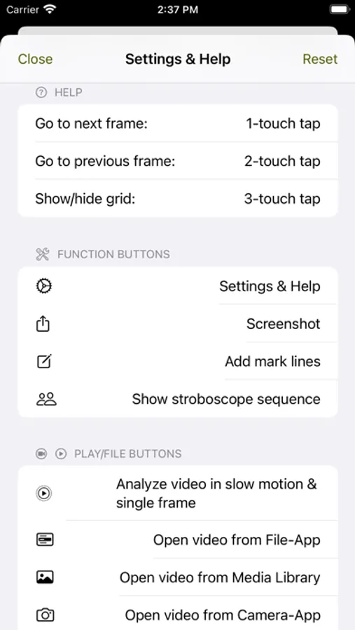 The app focuses on slow motion and single frame analysis. The zoom and rotation gestures can be used for this. The single image analysis is performed using the tap gesture. One image back with the 2-finger tap gesture.