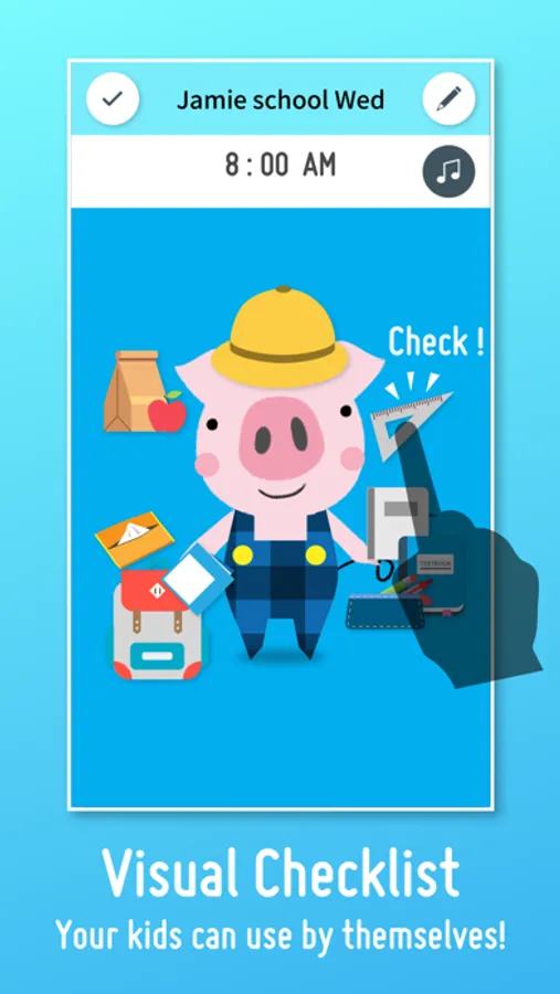Items that are often left behind when leaving home, such as a schoolboy’s handkerchief, grocery items, baby wipes, etc. etc… Checkie! helps you remind those items with fun!