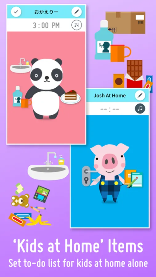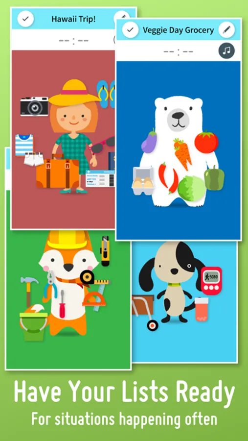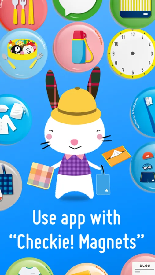 Everybody’s busy. So the timer directly starts the app and images are used instead of text so you can see and know what it is at a glance. All you have to do is touch the item when it’s ready. For the events that you don't know when to happen, such as outing with a baby, an irregular business trip, just prepare lists of them ready at hand! What you can enjoy the most of Checkie! is when preparing a list so that even a little kid gets interested in the process, which helps her/him aware of self management of the belongings.